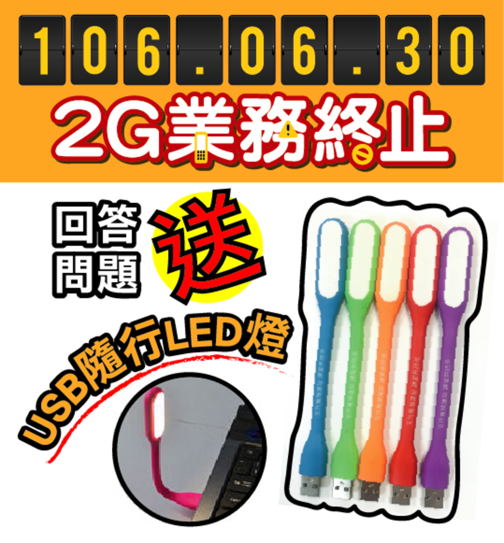 你們知道106年6月30日2G業務終止這消息嗎?下方有2G業務終止Q&A,從中找答案就有機會拿到USB隨行LED燈,接著小編要開始出題啦!